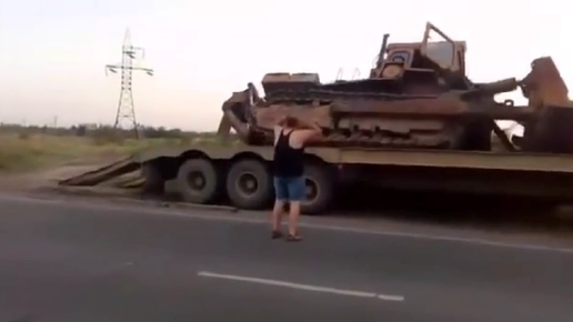 В процессе выгрузки тяжелого бульдозера «Т-330» произошла авария, где бульдозер улетел с трала