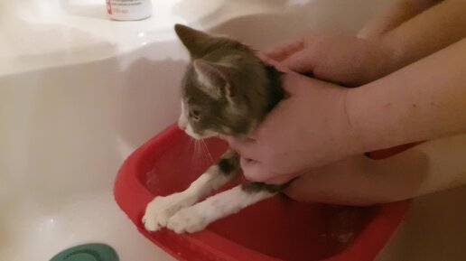 У котёнка банный день и новая игрушка.