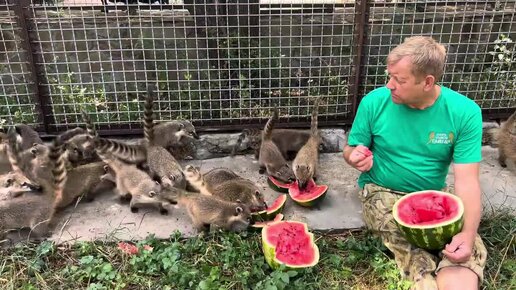Олег Зубков с Люськой и носухами завтракает арбузом в новом вольере парка львов Тайган #Тайган #Люся #ОлегЗубков