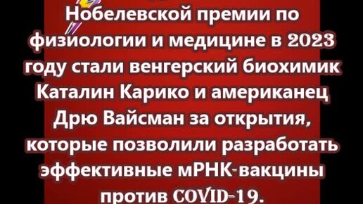 Лауреатами Нобелевской премии стали венгерский биохимик Каталин Карико и американец Дрю Вайсман за мРНК-вакцины против COVID-19