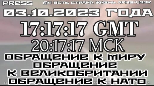 Прямой эфир 03.10.2023 17:17:17 GMT 20:17:17МСК🌍ОБРАЩЕНИЕ К МИРУ, ВЕЛИКОБРИТАНИИ, НАТО