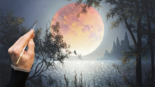 Ночной пейзаж - луна. Живопись акрилом. Мастер-класс от YNV art