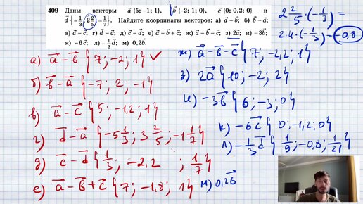 №409. Даны векторы а{5; —1; 1}, b { — 2; 1; 0}, с {0; 0,2; 0} и d {-⅓;2⅖; -1/7}. Найдите координаты векторов: а) а — b; б) b — а; в) а — с;