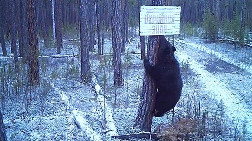 Мишка проверил, правильно ли установлены знаки в охранной зоне🐻 Видео поделились в Тунгусском заповеднике