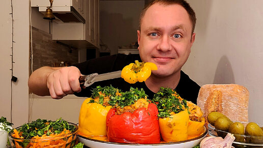 МУКБАНГ. ОБЖОР. ФАРШИРОВАННЫЕ ПЕРЦЫ СВИНО ГОВЯЖИМ ФАРШЕМ И РИСОМ. АСМР.