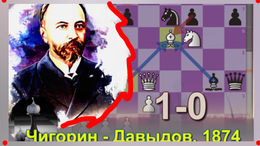 Михаил Чигорин, самый знаменитый "питерский" шахматист всех времен, белыми красиво ставит мат Давыдову в 1874 году. Гамбит Муцио в Паульсене