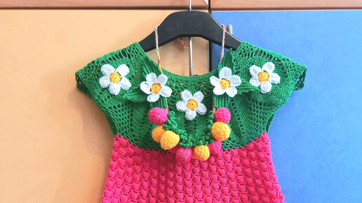 Ажурное платье крючком Малинка на девочку 2 - 3 года, летнее круглая кокетка сверху вниз без швов, кокетка ажурными листиками, 100 % хлопок