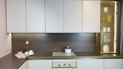 На видео современная кухня «Эстер 2». Трендовый вид ей придают фрезерованные фасады в сочетании с рифленым стеклом «Флутис» на витрине.