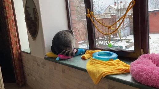 Енот разгуливает по дому в поисках развлечений.