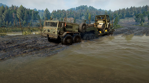 Маз-537 везет на полуприцепе трал, трактор Кировец К-700 ( SnowRunner )