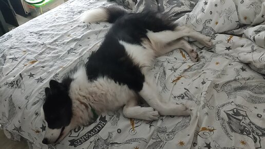 Просто хочу показать, как мой пёс радуется возможности полежать в кровати