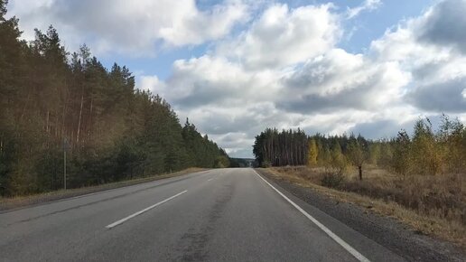 Обожаю этот кусок дороги: Сосны, солнце, облака в середине октября)