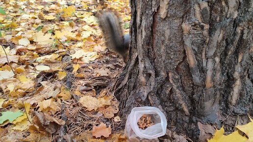 Две белки перепрятывают чужие орехи, гоняют друг друга