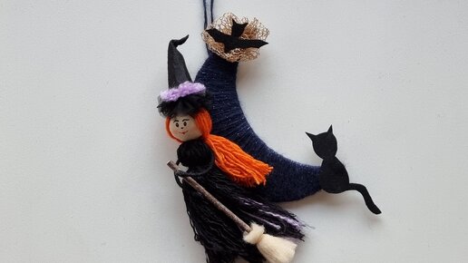 Ведьмочка с метлой из пряжи и кусочка ткани своими руками