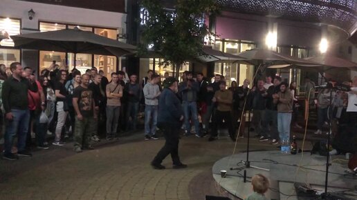 Толстяк лихо отплясывает лезгинку, к нему присоединяется местный алкаш