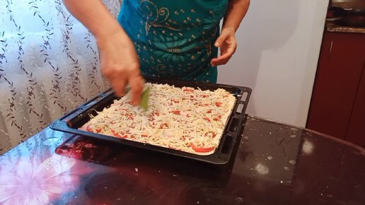 Наливная домашняя пицца с колбасой помидорами и сыром.