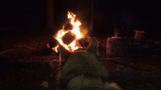 СЕРДЦЕ УШЛО В ПЯТКИ. ВНЕЗАПНО СОБАКА УЧУЯЛА ЧТО-ТО В ТЕМНОТЕ. НАШЛИ ОСТРОВ НА РЕКЕ И ЖИВЁМ НА НЁМ. ГРЕЕМСЯ У ТАЁЖНОГО КОСТРА.
