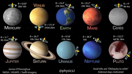 КАК ВРАЩАЮТСЯ ПЛАНЕТЫ?Вот очень полезное видео, обобщающее характеристики планет с точки зрения периода вращения и наклона оси
