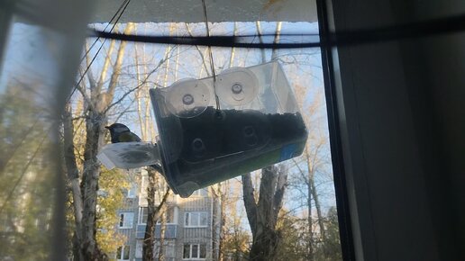 Кормушка на оконном стекле в городе. Посетители