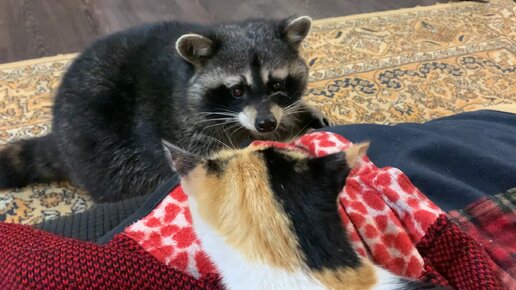 Кошка Лола и енот Семен. Вот такое знакомство)