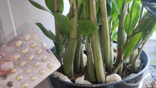 Далее: Добавляю 2 таблетки в полив и больной замиокулькас оживает, нарастит мощные корни и клубень, показываю результат своих наработок