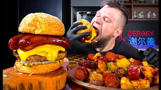 МЕГА БУРГЕР С КОЛБАСОЙ, ЗАПЕЧЕННАЯ КАРТОШКА С ГРИБАМИ, ASMR MUKBANG, АСМР МУКБАНГ, 먹방, 大食い, たべる, 谢尔盖