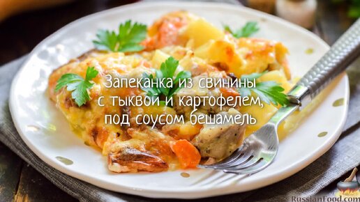 Тающее во рту мясо и мягкие овощи под румяной корочкой. Запеканка из свинины с тыквой и картофелем, под соусом бешамель