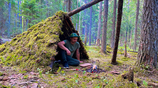 Бушкрафт-кемпинг: укрытие для выживания из упавшего дерева, приготовление пищи на костре.
