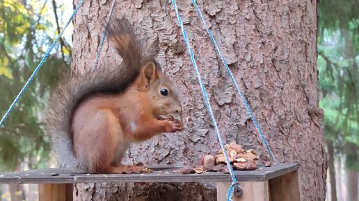 Бельчонок погрыз кедряшки и убежал с грецким орехом