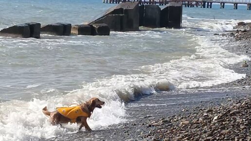 Бесстрашный пёс, играющий в морском шторме