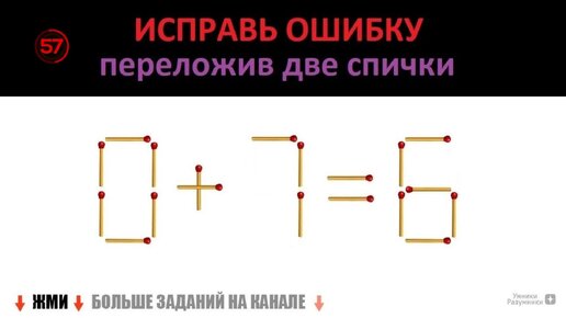 Головоломка со спичками 🥢 0+7=6 😎 Исправь ошибку переложив только две спички и получи верное равенство ⚡️ Задание для разминки мозга