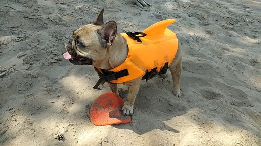 Песок, тарелка и река - всё, что нужно для счастья бульдога.