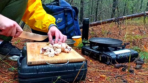 Приготовили яичницу с инжиром в осеннем хвойном лесу