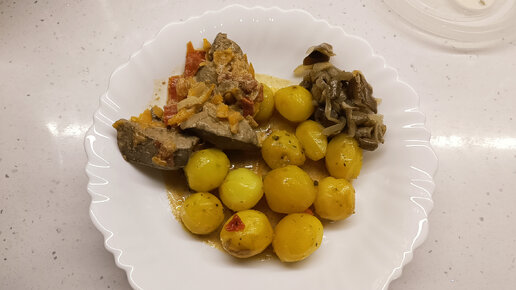 Печень из индейки в сметане и картошка запеченая в рукаве на гарнир с грибами