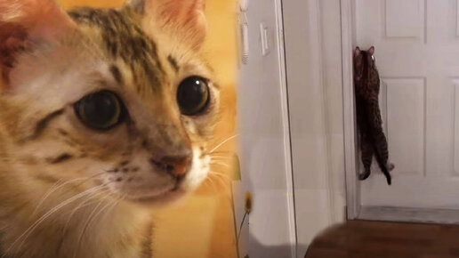 Кошка повисла на дверной ручке и изо всех сил пыталась попасть в комнату к котятам