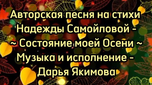 "Состояние моей Осени" Стихи: Надежда Самойлова. Музыка, исполнение: Дарья Якимова. https://www.youtube.com/watch?v=jSeGF95lUac