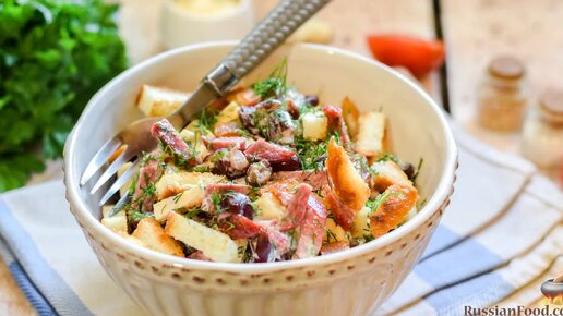 Отличный вариант сытного блюда. Салат с консервированной фасолью, колбасой, сыром и сухариками