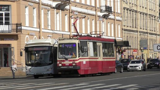 "Оборот!" Трамвай ТС-77 №3620 по маршруту №3 на Сенной площади в Санкт-Петербурге, сентябрь 2023 года