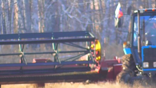 Сенокос поздней осенью в Сибири краткий обзор трактор МТЗ работает в поле с прицепным оборудованием жаткой косит траву на сено деревня жизнь