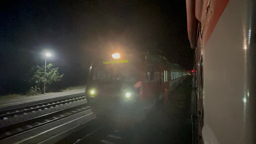 Встречные поезда в ночи: две ЭД4М, "Ласточка" ЭС1, два "Дончака" с пассажирскими из окна поезда, 2023г.