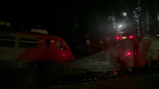 "Теплоласточка!" Тепловоз ТЭП70БС с электропоездом "Ласточка" ЭС2ГП - 012 и отправление с ст.Хийтола (из окна поезда)