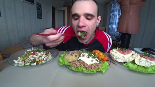МУКБАНГ СОТЕ ИЗ ЦЫПЛЕНКА / БИТОК ИЗ ТРЕСКИ / САЛАТ / БУТЕРБРОДЫ / Mukbang EATING / ASMR / АСМР #926