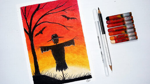 Как нарисовать чучело / пугало масляной пастелью - Рисунки на Хэллоуин