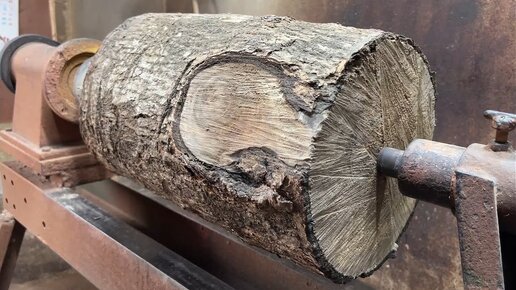 Бревно с толстой корой установил на станок и крутанул до вазы, с ломаными краями.
