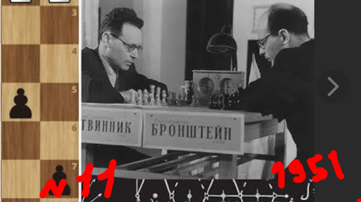 Давид Бронштейн (черные) в этой партии матча №11 проявил стойкость и расчетливость - обыграл Михаила Ботвинника в 39 ходов (Москва, 1951)