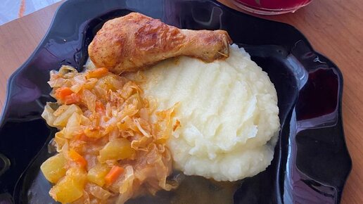 Обед, картофельное пюре, овощи, куриные голени.