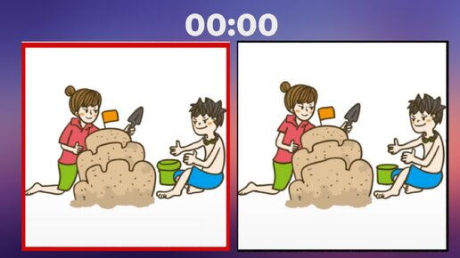 Девочка с мальчиком строят песочный замок. Найди три отличия на картинке.