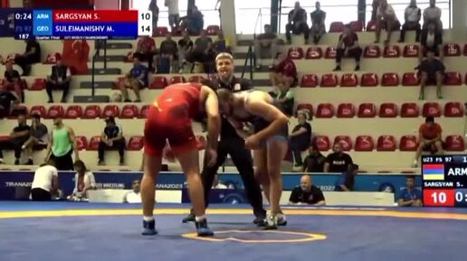 Кадры победного раунда армянского спортсмена Сергея Саркисяня (97 кг) в четвретьфинале на чемпионате мира U23 по вольной борьбе