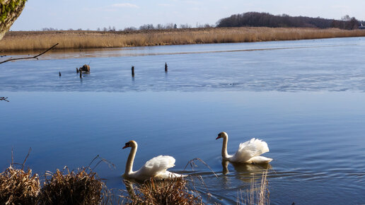 Лебеди на воде. Гурьевск (Калининградская область). 01 апреля 2018 года.