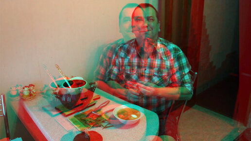 3D stereo red-cyan Суп из баранины в горшочке с сельдереем в духовке